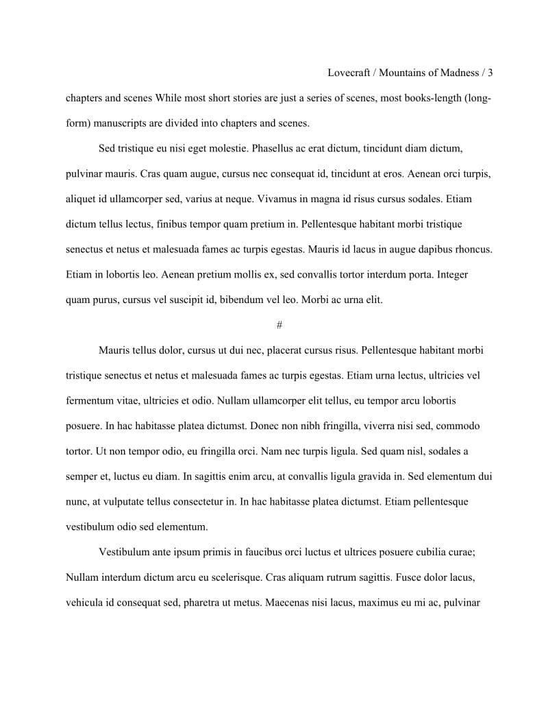 | Dinkus and The End Markers | Scene separation marker (#), and story end marker (The End); both are centered and double-spaced |